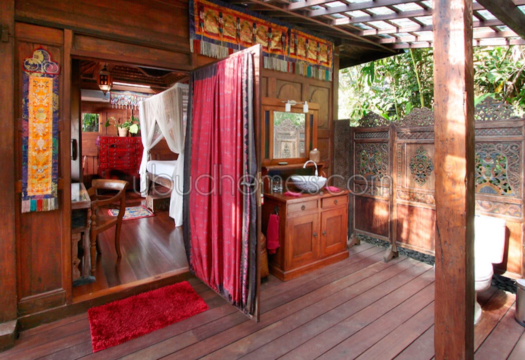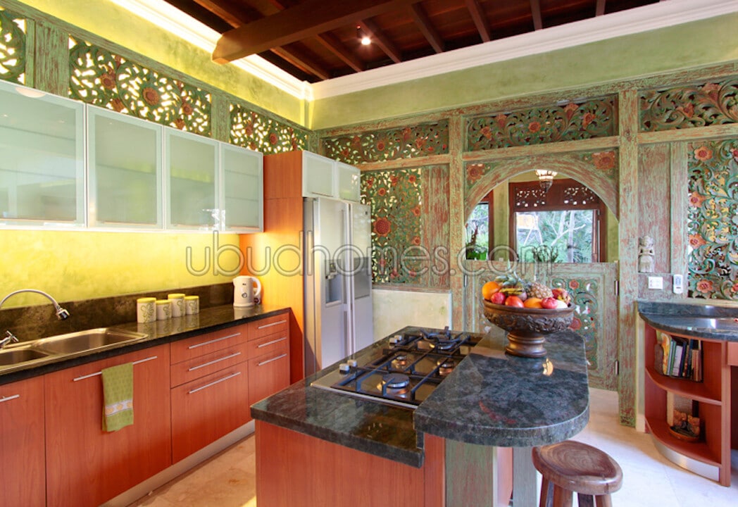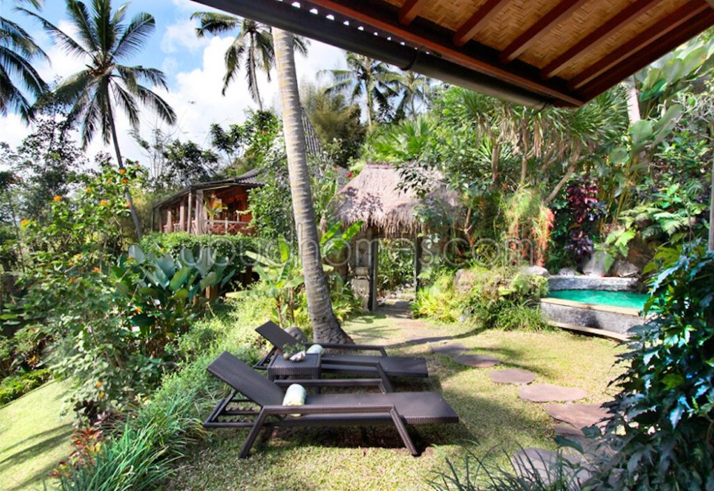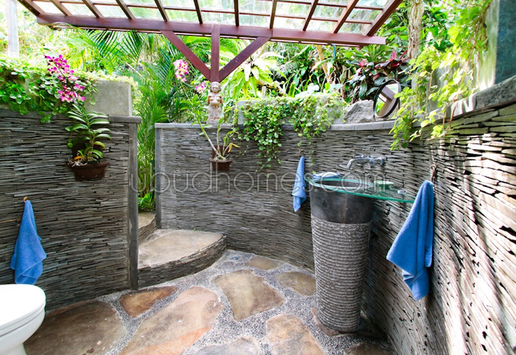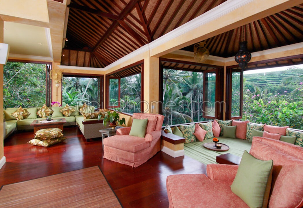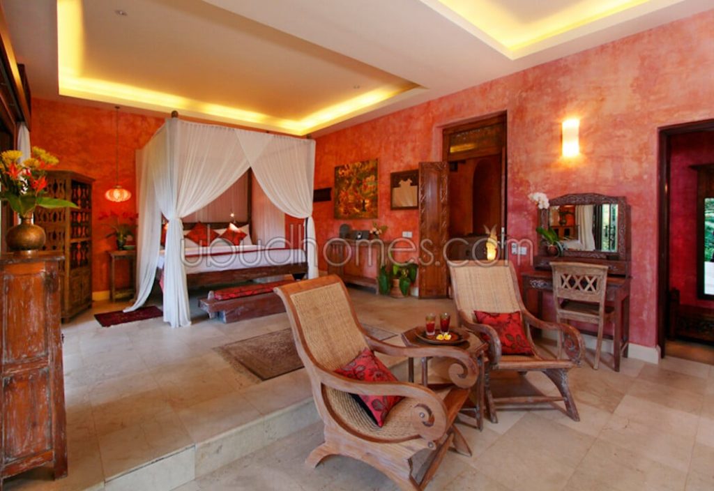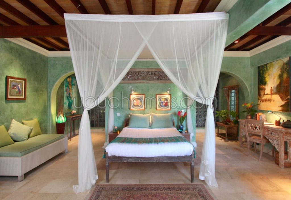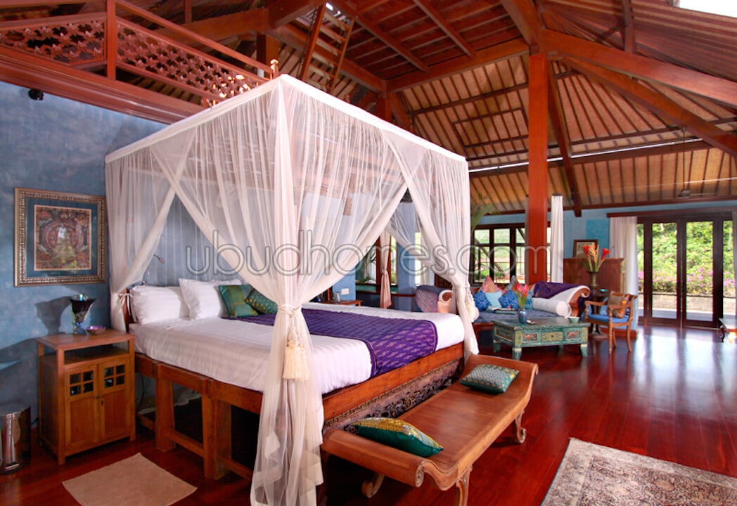 This exceptional estate, one of only a handful of properties in Ubud that is genuinely qualified to be called as such, was constructed to a standard that is second to none. Painstakingly built with great attention to detail, this magnificent property sits next to a gorgeous river and valley view and can easily accommodate a large family or group. With its colorful Balinese and Medeterranian influenced accents, this house has something for everyone. The master bedroom is on the grandest of scale and the central living room has features unlike any other property for rent in Ubud. There are 2 pools, a circular sun deck overlooking the river, 3 kitchens, a private sauna, and many places throughout the property to relax, read, create art, practice yoga or just spend time with friends and family. There are also two beautifully restored, freestanding antique joglo buildings of different sizes on each side of the main structure. Truly a unique and special property to live comfortably, securely, and have the ability to entertain in.